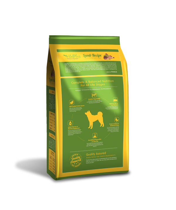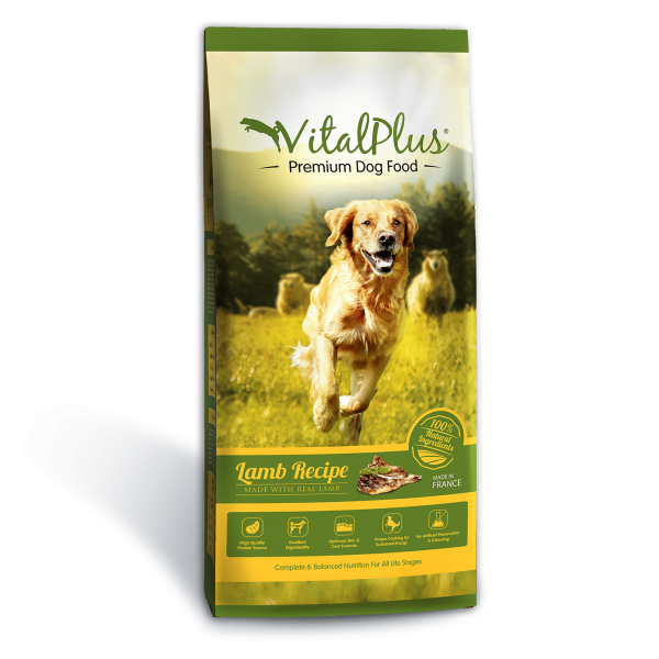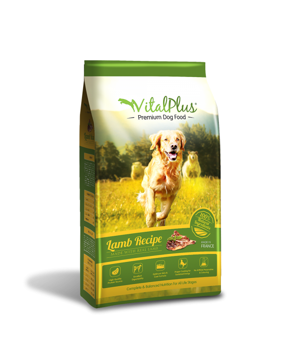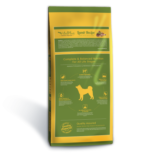 VitalPlus Premium Dog Food Lamb Recipe is a complete and balanced food for dogs of all breeds. It is made with real lamb of high biological value and energy dense selected quality proteins with vitamin and minerals the dogs require for a healthy life. Our Lamb recipe contains highly digestible carbohydrates to aid in digestion and help preventing intestinal disorder. In addition, it is enriched with various supplements to support the overall wellbeing of the dogs.Vitamin A, copper and essential fatty acids to promote a soft and shiny coat, Vitamin E and Selenium to strengthen the immune system . Hard and crunchy kibble also helps to strengthen the teeth and promote dental care.