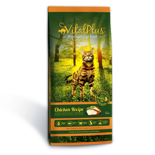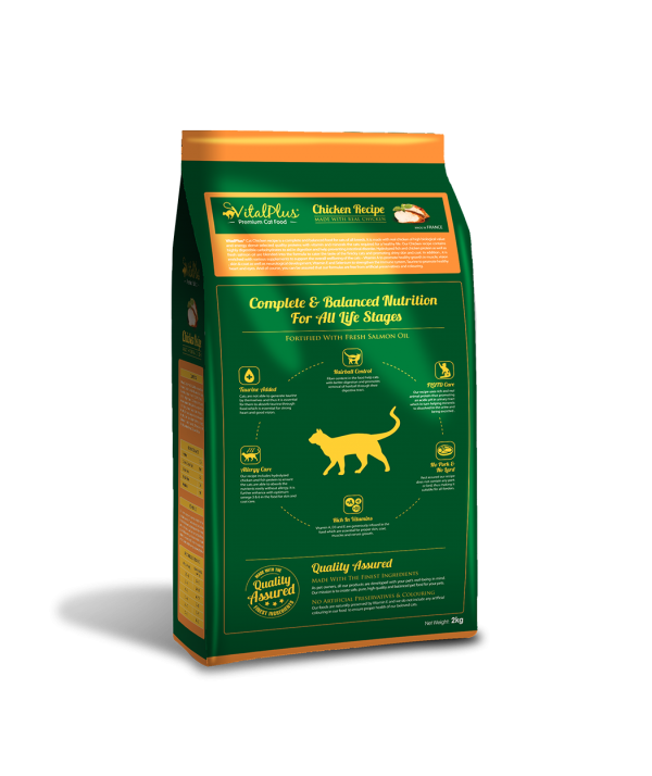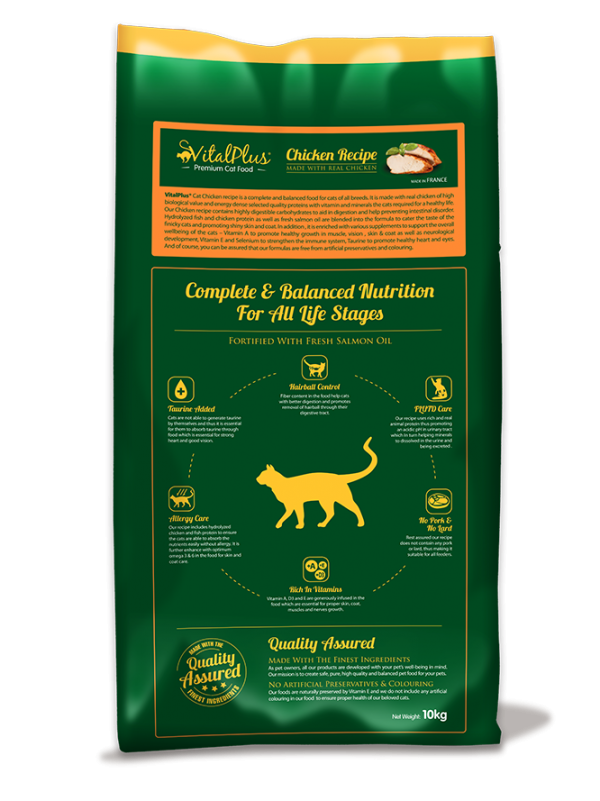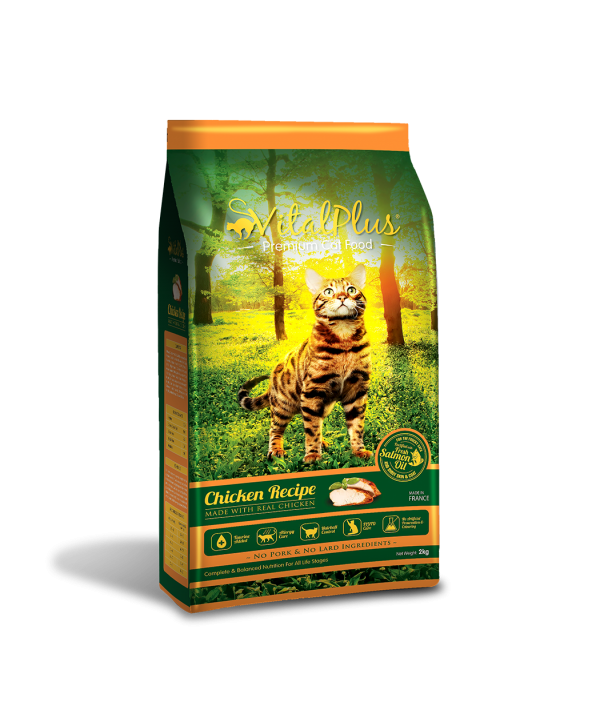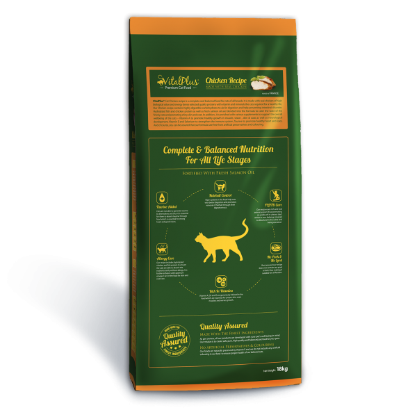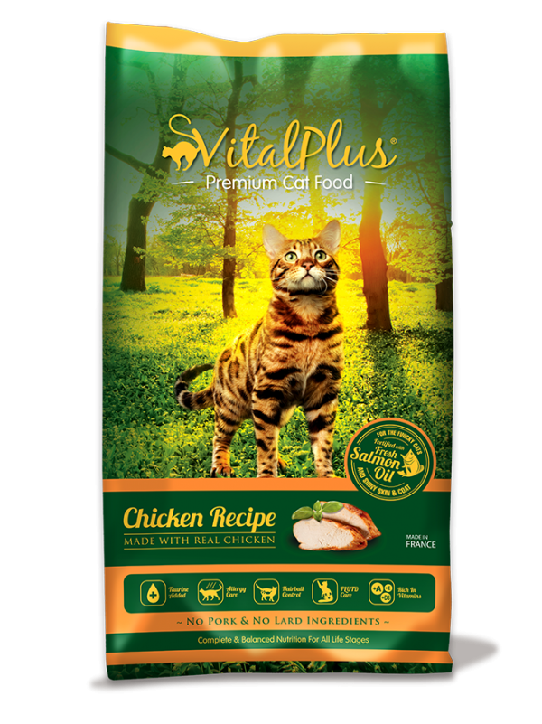VitalPlus Cat Chicken recipe is a complete and balanced food for cats of all breeds. It is made with real chicken of high biological value and energy dense selected quality protein with vitamin and minerals the cat required for a healthy life. Our Chicken recipe contain highly digestible carbohydrates to aid in digestion and help preventing intestinal disorder. Hydrolyzed chicken and fish protein as well as fresh salmon oil are blended into the formula to cater the taste of the finicky cats and promoting shiny skin and coat. In addition, it is enriched with various supplements to support the overall wellbeing of the cats – Vitamin A to promote healthy growth in muscle, vision, skin & coat as well as neurological development, Vitamin E and Selenium to strengthen the immune system, Taurine to promote healthy heart and eyes. And of course, you can be assured that our formulas are free from artificial preservatives and colouring.